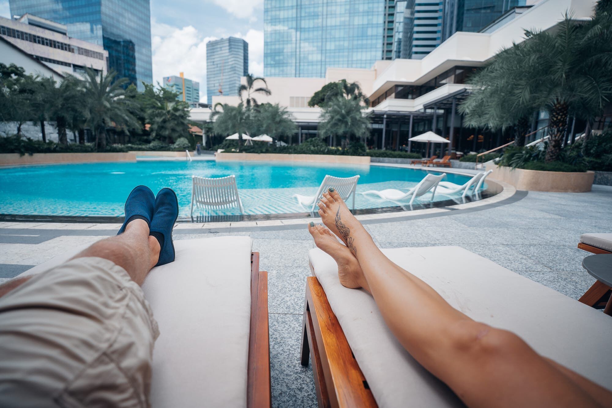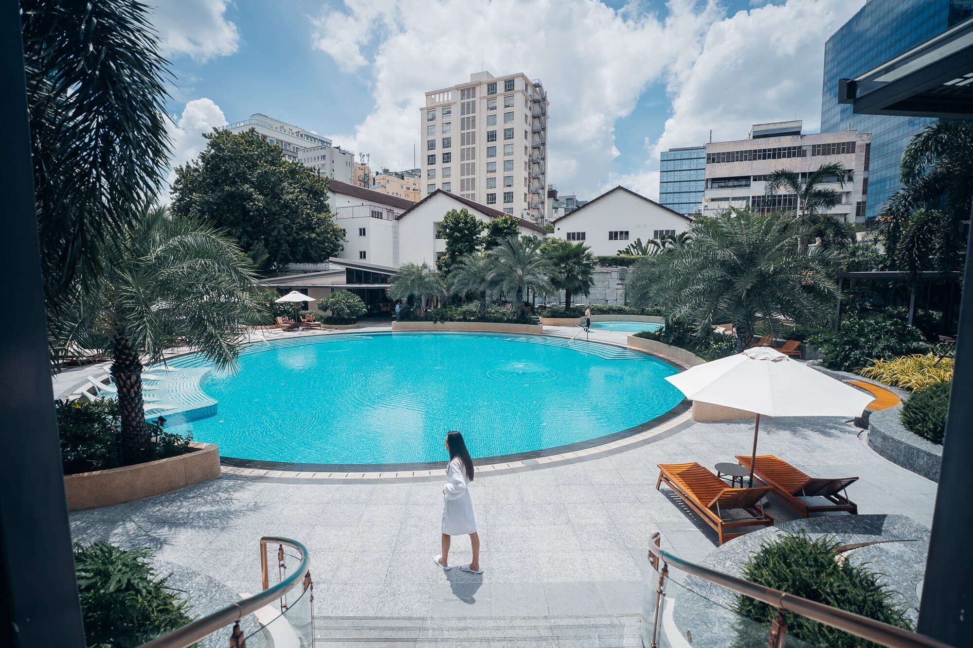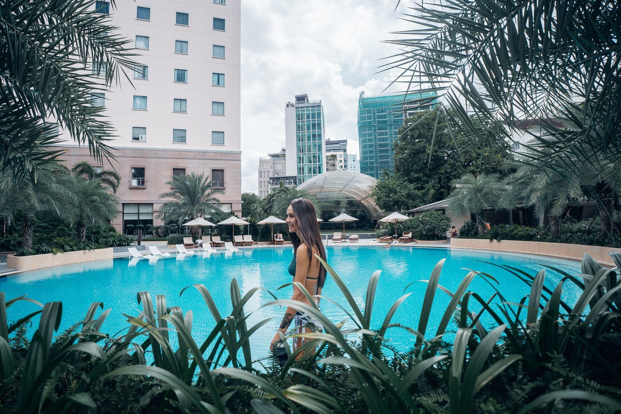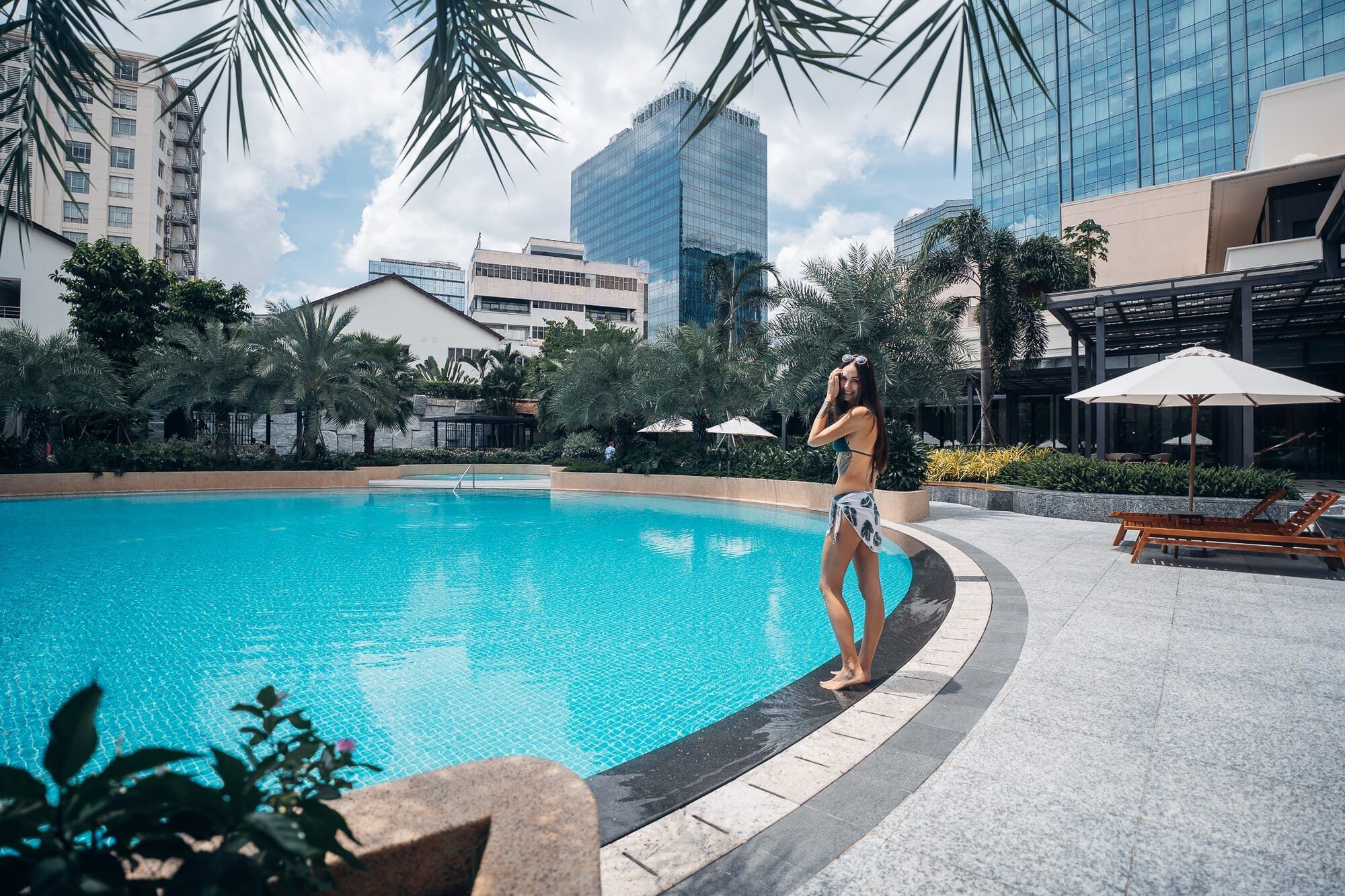 Unseren zweiten und eigentlich ersten richtigen Tag in Ho Chi Minh haben wir ganz entspannt im Hotel begonnen. Nach dem Aufstehen und einem schnellen selbstgemachten Frühstück (Haferflocken mit Banane und Milch in den Hotelzimmergläsern) haben wir es uns nicht nehmen lassen, den Pool und die Sonne dort etwas zu genießen. Und es hat so gut getan, einfach mal dort in der Sonne zu liegen, die Ruhe zu genießen und im kühlen Nass zu baden. Tatsächlich haben wir beide festgestellt, dass die Ankunft in unserem Zimmer in Ho Chi Minh das erste mal seit über einem Monat ist, dass wir es nahezu still und ruhig haben. Dort hören wir keinen lauten Verkehr, keine durchgehendem Lautsprecherdurchsagen von Banh Bao Straßenverkäufern oder anderen, kein Gehupe oder Rufe von Menschen und auch keine laute Musik. Bis auf das sanfte Rauschen der Klimaanlage ist es im Lotte Hotel in Ho Chi Minh einfach sehr ruhig. Uns war schon vorher bewusst, dass wir die Ruhe vermisst haben aber jetzt wurde uns erst klar, wie wohltuend es ist auch einfach ist, wenn es um einen herum mal still ist. Auch im Poolbereich ist es ruhig, sodass wir uns dort sehr wohl gefühlt haben. Die warme Sonne auf der Haut zu spüren tat ebenfalls sehr gut und sie haben wir den Vormittag in aller Ruhe im Poolbereich auf den Liegen verbracht. Da wir auch direkt ein kleines Café am oder sogar im Hotel haben, war auch für Kaffee gesorgt. Mit Blick auf die Hochhäuser in Kombination mit den sattgrünen Palmen, den sanften Wasserplätschtern und dem türkisblauen Pool fühlte es sich an wie ein kleines Paradies.
