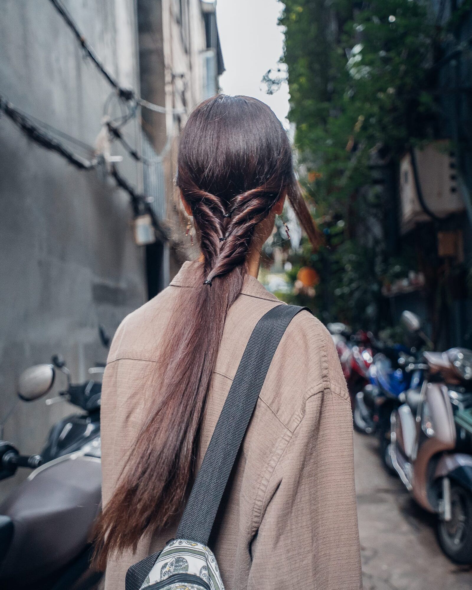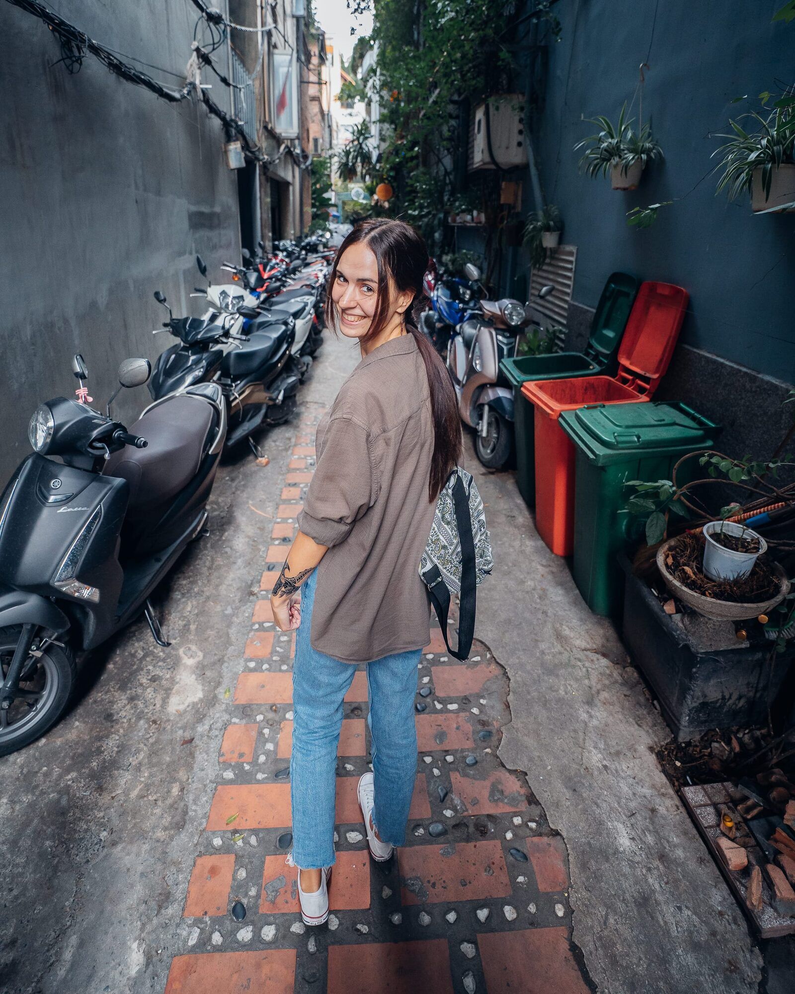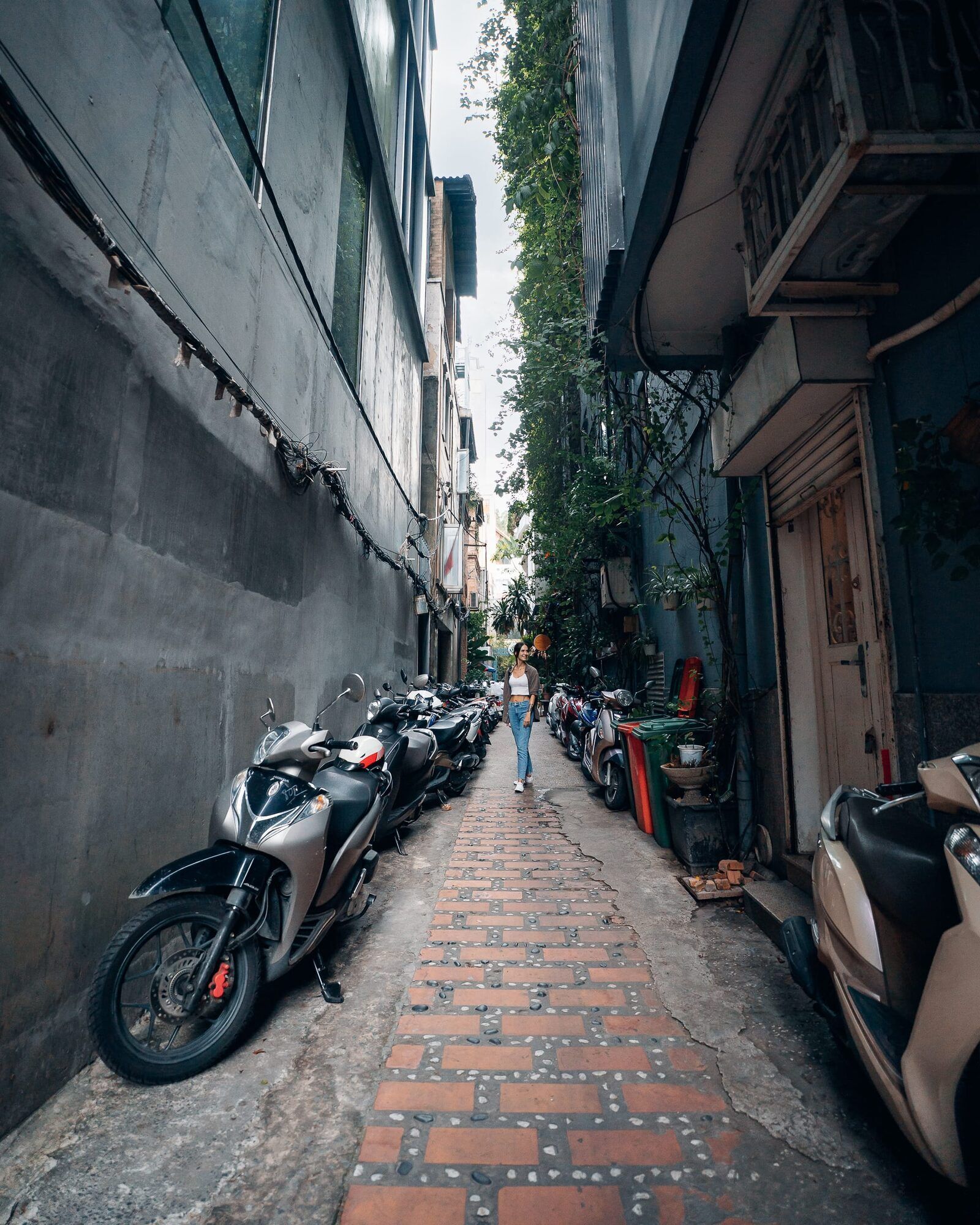 Gegen Mittag haben wir uns dann aber auch wieder aufgemacht und sind bepackt mit unseren Laptops in das Nomad Cold Brew Café aufgebrochen. Dieses befindet sich in einer unfassbar schmalen Gasse und ist leicht zu übersehen. Von der Hauptsstraße wirkt es eher, als würde man in eine Sackgasse oder auch direkt in die Wohnhäuser der Vietnamesen gehen. Obwohl die Gasse an sich schon sehr schmal und eng ist, parken hier natürlich trotzdem Roller. Diese sind aber ordentlich und millimetergenau auf einer Seite der Gasse aufgestellt und zum Teil sogar mit Steinen unter den Ständern etwas aufgebockt, damit sie nicht zu weit in die schmale Straße hineinragen. Eine smarte und sehr clevere Idee, finde ich. Das Nomad Cold Brew Café war leer, sodass wir dort auch in aller Ruhe arbeiten konnten. Mit Klimaanlage, Strom, einem Tisch und einem Coldbrew Coffee für Marc hatten wir hier auch alles, was wir brauchen. Ich habe mich nach einer Zeit raus gesetzt auf die breite Fensterbank, da mir drinnen zu kühl war. Hier musste ich beim Arbeiten zwar die Füße einziehen, da mir sonst die Roller darüber gefahren werden, aber ich hatte einen schönen Blick auf die grünen Pflanzen rundherum. So haben wir dort ein paar Stunden verbracht, fleißig gearbeitet und einige Dinge online erledigt, bevor wir dann weiter gezogen sind.