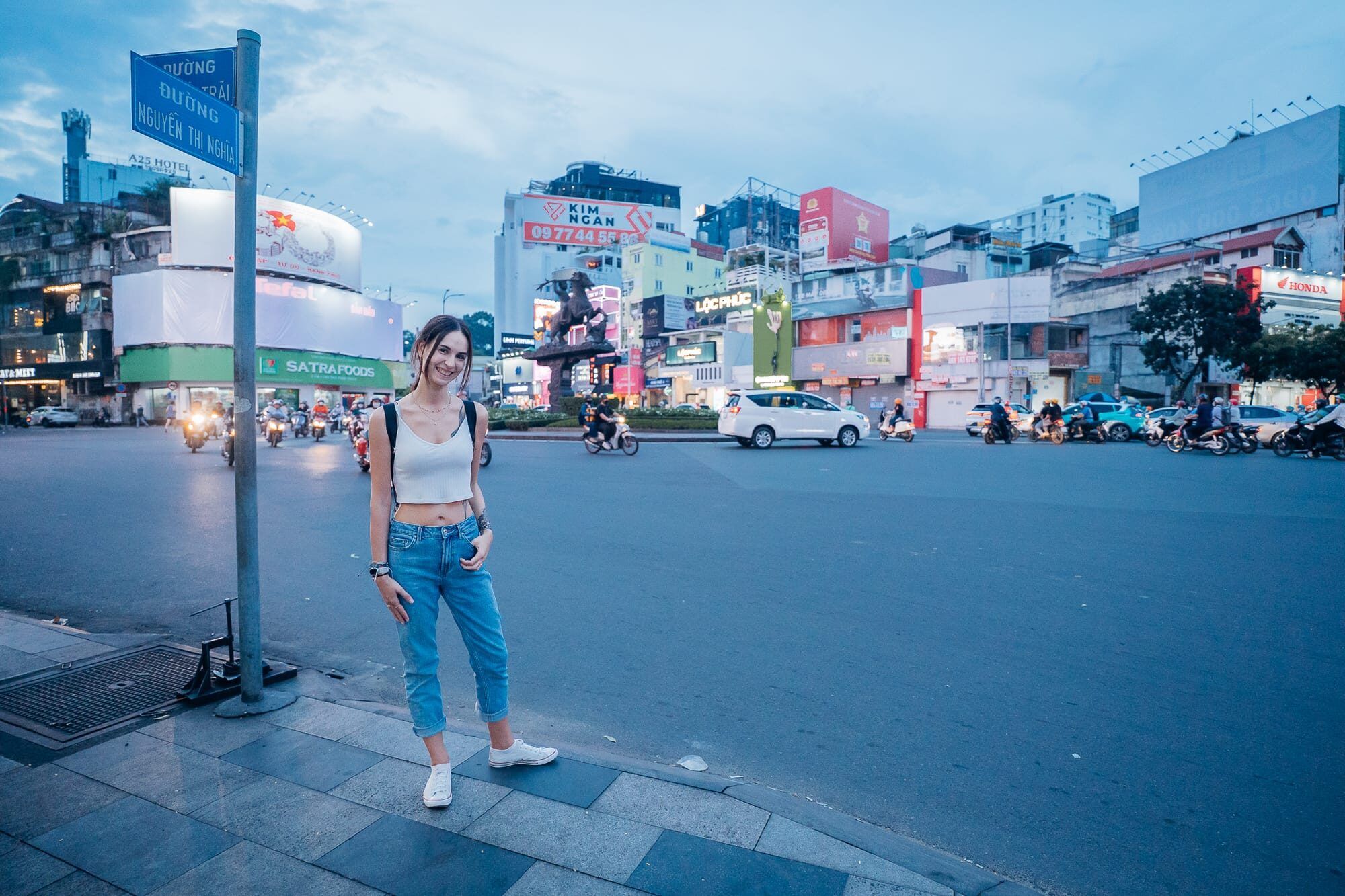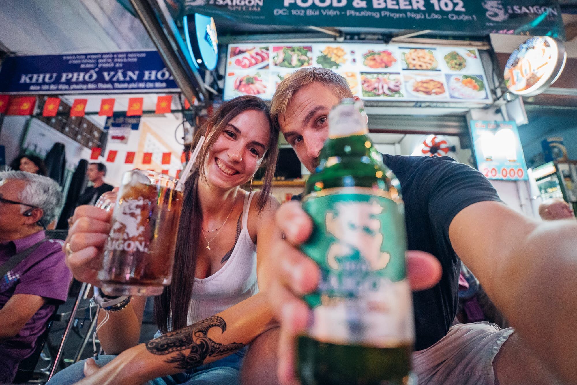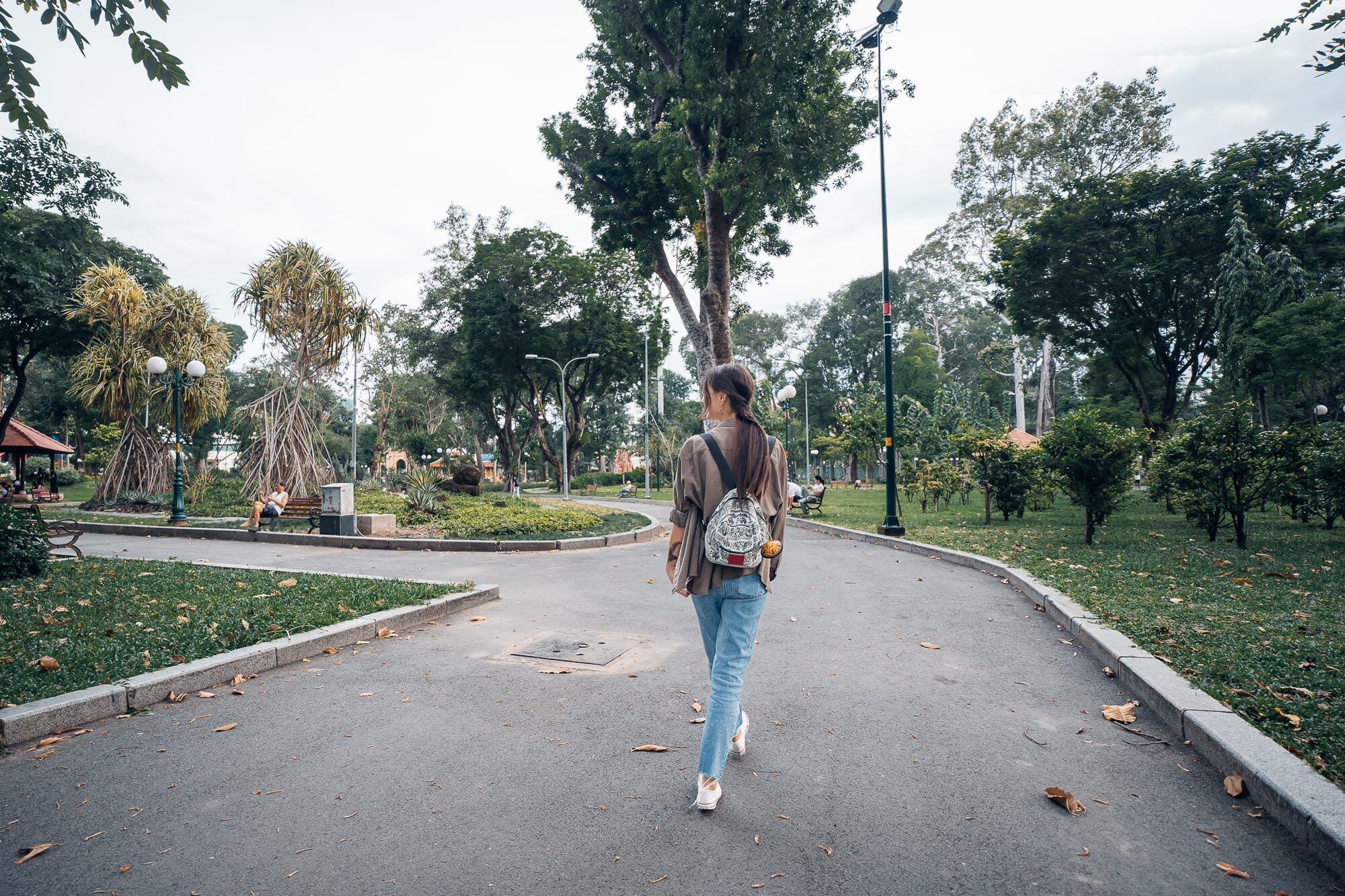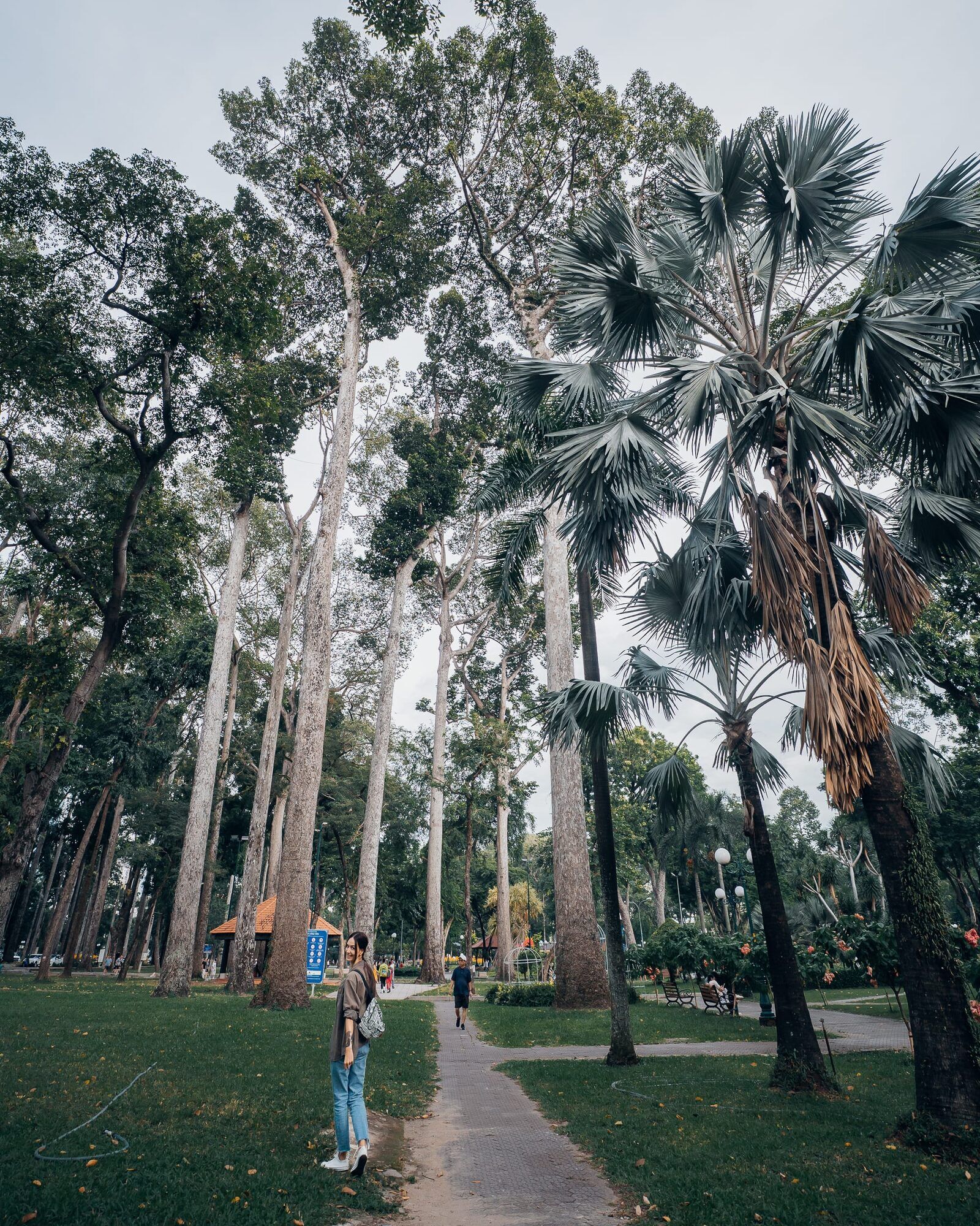 Diesmal ging es zufuß weiter. Durch den Tao Dan Park sind wir durch die vietnamesische Stadt spaziert und staunten nicht schlecht über die enorm riesigen, bombastischen langen Bäumen, die nahezu unendlich in die Höhe ragten. Der Tao Dan Park ist außerdem ebenfalls ein sehr schöner Ort zum spazieren und entspannen. Alles ist grün, schön gestaltet und mit dekorativen Elementen verziehen. Nicht nur die gigantischen Bäume sind unfassbar beeindruckend sondern auch die Vielfalt der verschiedenen Pflanzen, Bäume und Blumen. Hier blühte es an jeder Ecke und es gibt viele Bänke, um sich niederzulassen und in Ruhe den Blick und auch die Gedanken schweifen zu lassen. Etwas, was wir auch das ein oder andere mal für ein paar Minuten getan haben. Unser Weg führte uns durch den Park und schließlich durch die Straßen von Ho Chi Minh in Richtung der Bui Vien Walking Street. Das Überqueren der Straßen und besonders der Kreisverkehre ist in Vietnam generell eine kleine Herausforderung, da es ist unfassbares Verkehrschaos ist. Man muss sich mit Ruhe aber auch mit Mut Schritt für Schritt vorwagen, dann fahren die Roller und Autos um einen herum. An der Bui Vien Walking Street angekommen haben wir uns am Straßenrand in einem kleinen Lokal auf Klappstühlen ein kühles Bier sowie eine Cola bestellt und anschließend dem Treiben auf der Partystraße Ho Chi Minhs zugesehen. Hier gibt es viele Clubs, Bars und Diskotheken, eine lauter und größer als die andere. Die Straße selbst wird jedoch bis zum späteren Abend von Autos und Rollern befahren, was wir etwas gefährlich fanden. Da wir beide aber genug von lauter Musik, Chaos und dem ganzen Trubel hatten, haben wir uns nur in Ruhe unsere kühlen Getränke schmecken lassen. Anschließend ging es für Marc noch spontan zum gegenüberliegenden Barbier für einen frischen Haarschnitt. Anschließend sind wir die Bui Vien Walking Street noch einmal hinunter geschlendert, waren am Schluss noch Getränke einkaufen und sind schließlich mit dem Taxi zurück in unser ruhiges Hotel gefahren, wo wir uns dann noch etwas zu Essen aufs Zimmer bestellt haben. Eine Auswahl vietnamesischer veganer Gerichte wie einer Pho, Summerrolls mit Drachenfrucht, einer Nudel-Bowl und Reiscracker.