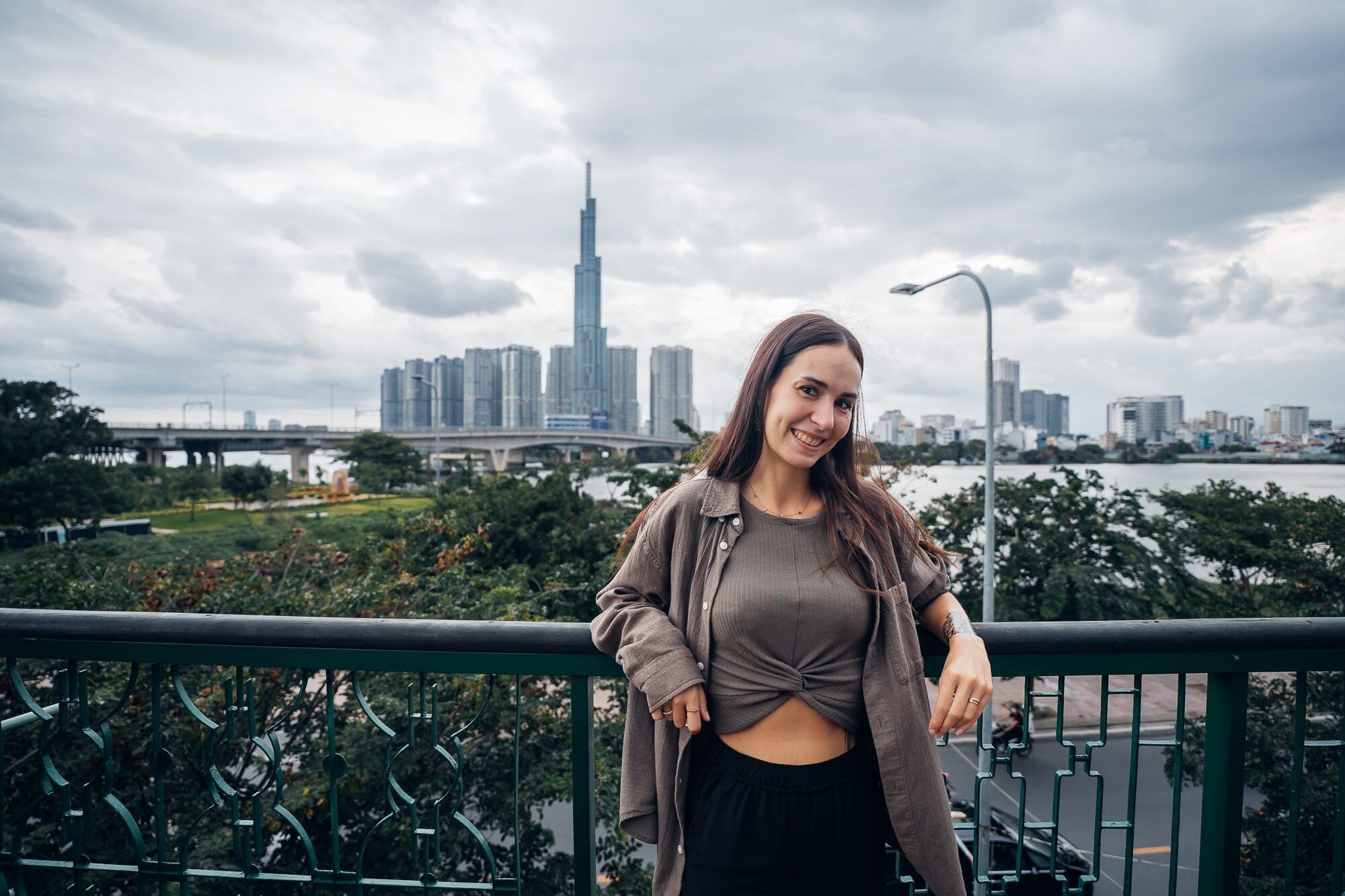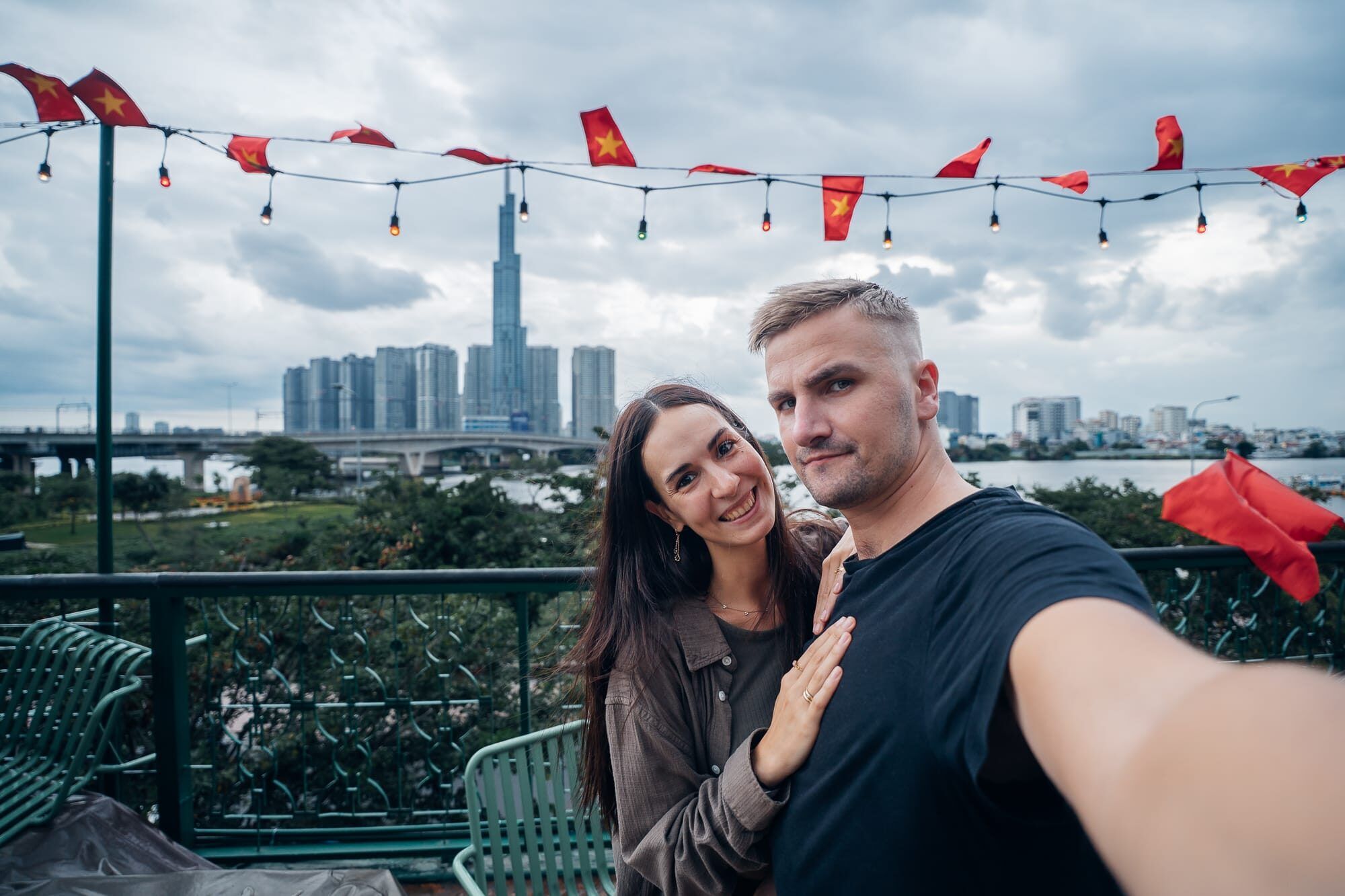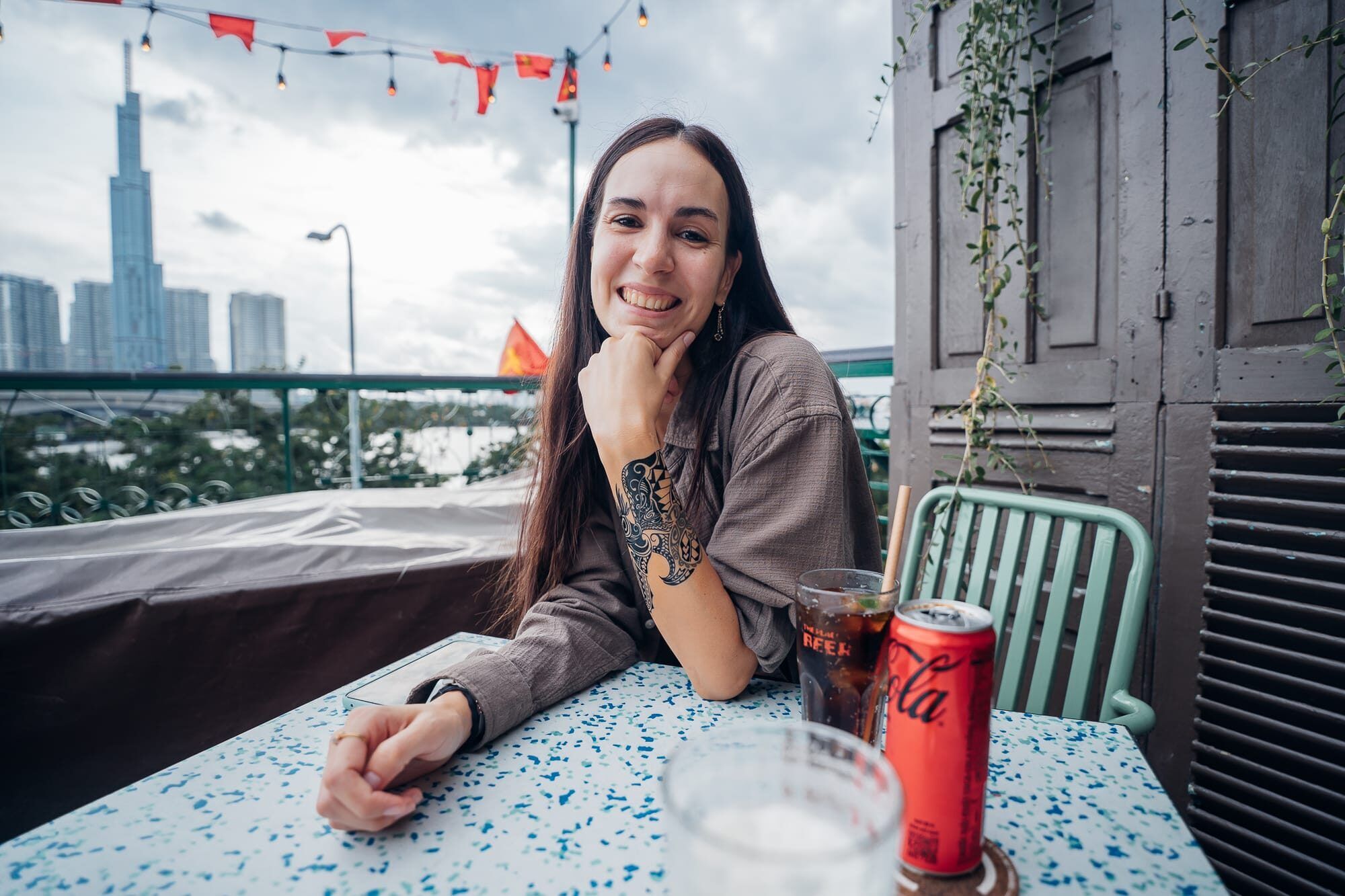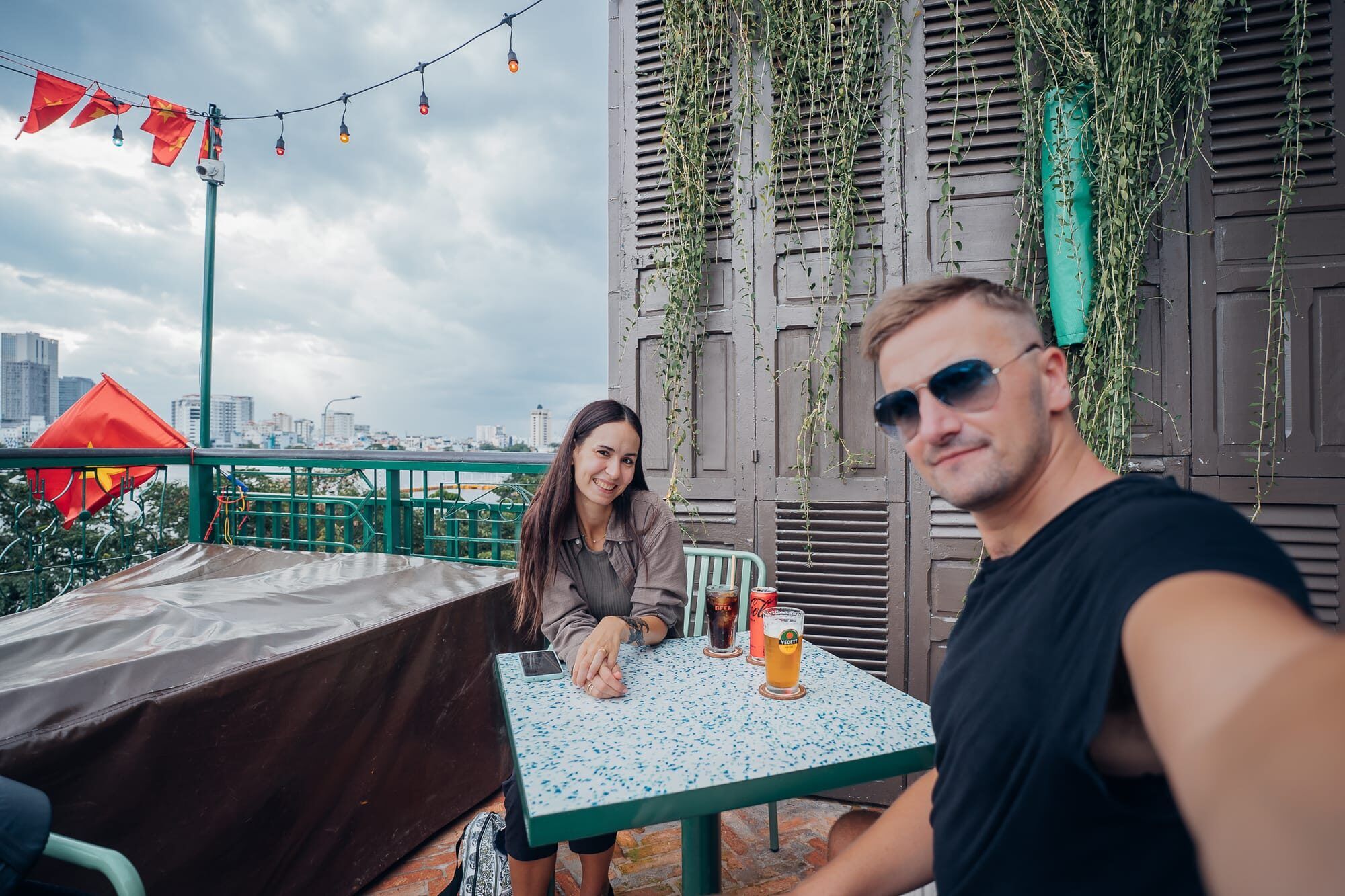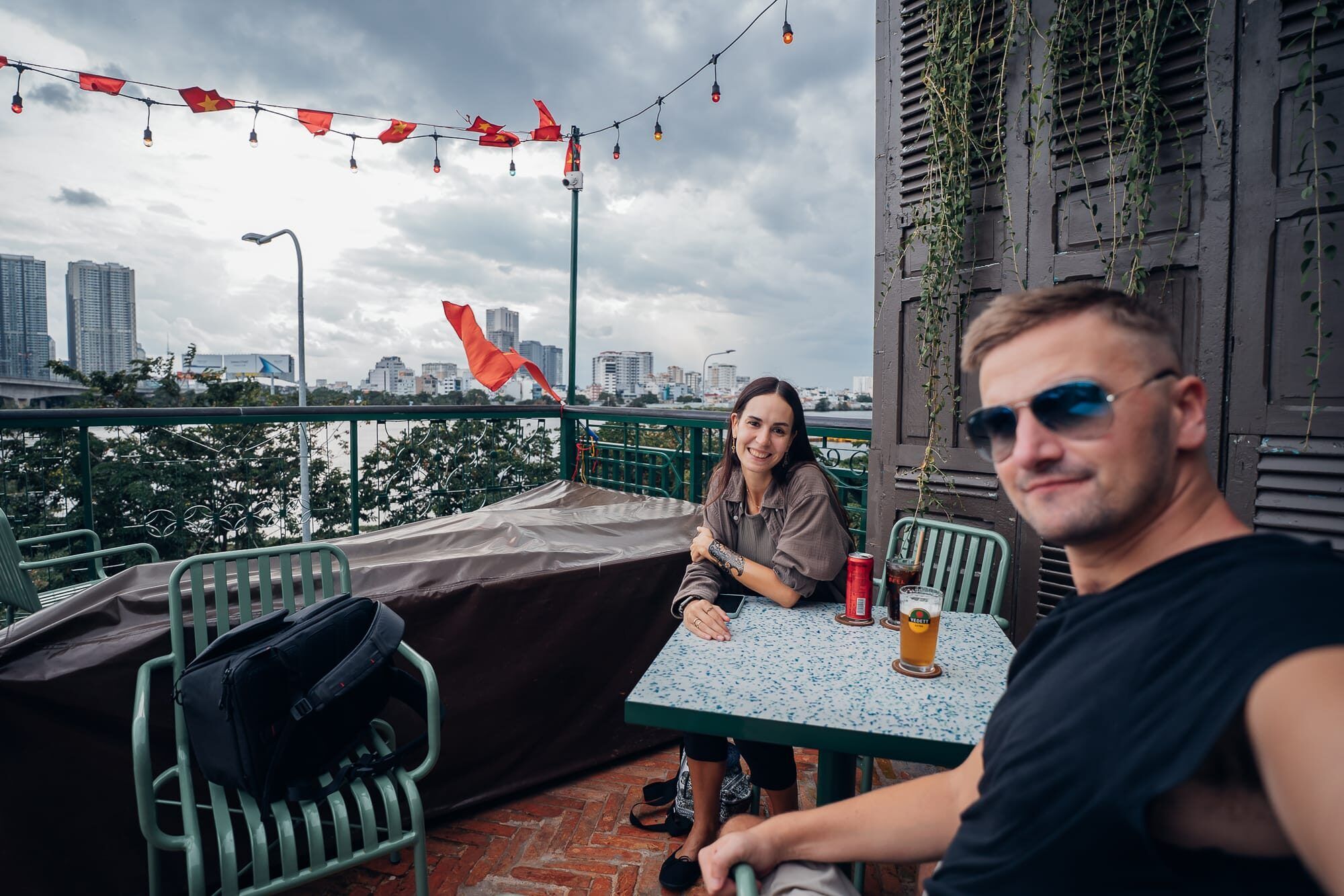 Anschließend sind wir von dort zu Fuß zu einer Rooftopbar in der Nähe spaziert, wo wir uns auf dem Dach in der dritten Etage ein Bierchen und eine Cola genehmigt haben. Mit Blick auf den Financetower und die Hochhäuser von Ho Chi Minh sowie den Fluss haben wir hier den Sonnenuntergang abgewartet. Da es aber ein eher grauer Tag war, hatten wir hier leider Pech. Als es dann auch noch anfing leicht zu nieseln und für den restlichen Abend auch Regen sowie Gewitter gemeldet war, sind wir von der Bar mit dem Taxi zu der Vincom Mega Mall gefahren. Diese wäre zwar nicht all zu weit entfernt, allerdings ist es echt eine Qual und sehr anstrengend zu Fuß hier herumzugehen. Kurz nachdem wir in der Mall angekommen waren, regnete es dann auch in Strömen, sodass wir hier zumindest Glück hatten. Leider hat uns die Mall an sich nicht so gut gefallen. Vielleicht liegt es daran, dass wir anderes aus Thailand, Doha, Dubai oder auch anderen asiatischen Orten kennen - aber wir stellen immer wieder fest, dass die Malls in Vietnam nicht mit denen in Thailand vergleichbar sind. Dennoch sind wir hier herumgeschlendert, haben noch einen Kaffee getrunken und die Zeit etwas totgeschlagen, bevor wir schließlich erneut mit dem Taxi in das nur 5 Minuten entfernte Kashew Cheese Restaurant gefahren sind. Dort haben wir gemeinsam vegan zu Abend gegessen: Pizza, Pitabrot mit Tzatziki, ein Panini und einen Salat mit Drachenfrucht und veganen Cashew-Käse. Alles war sehr lecker, besonders der Apfel-Zimt-Smoothie. Aufgrund des Regens sind wir dann auch per Taxi zurück ins Hotel und haben den restlichen Abend mit Serie im Bett verbracht.