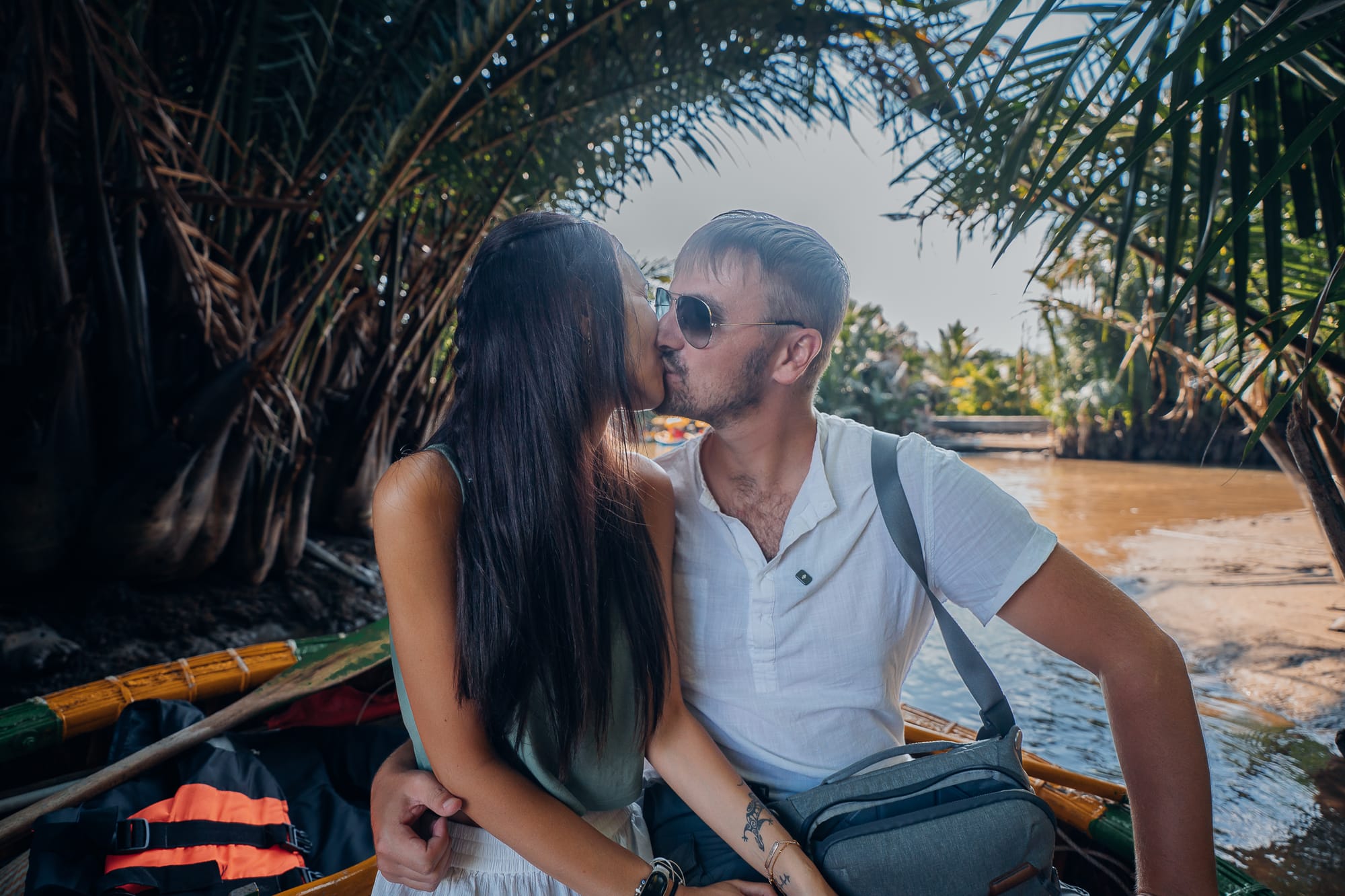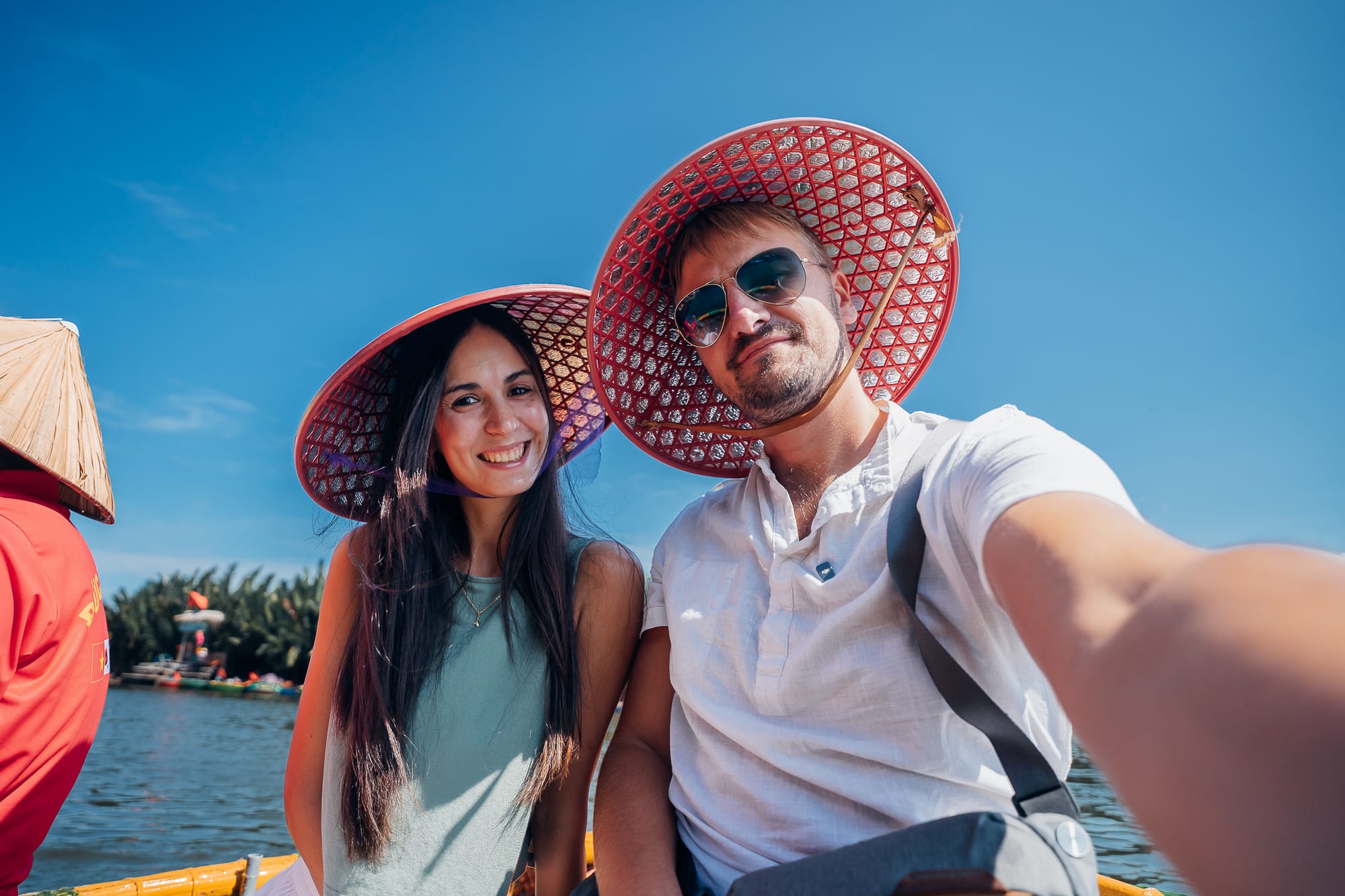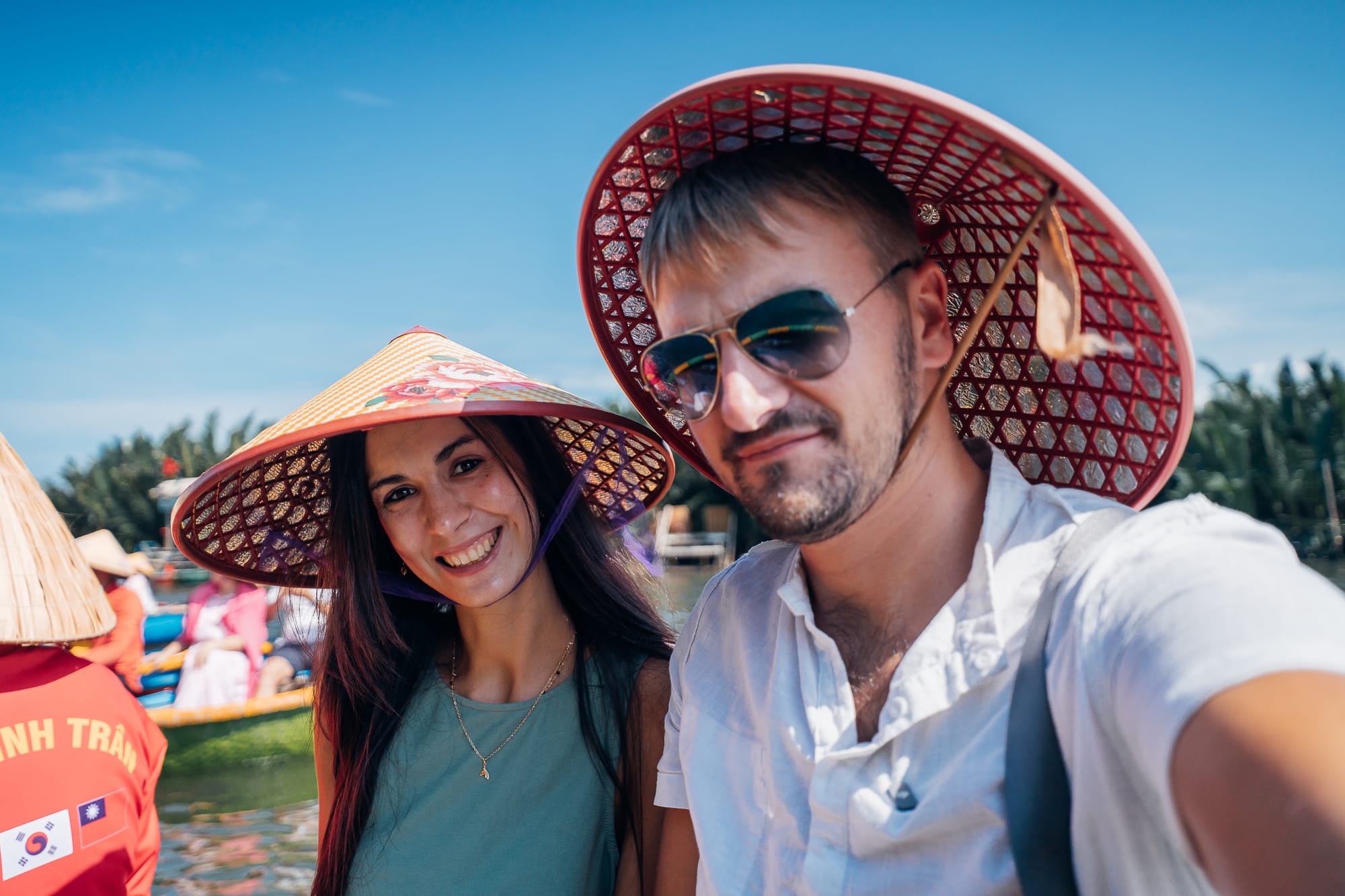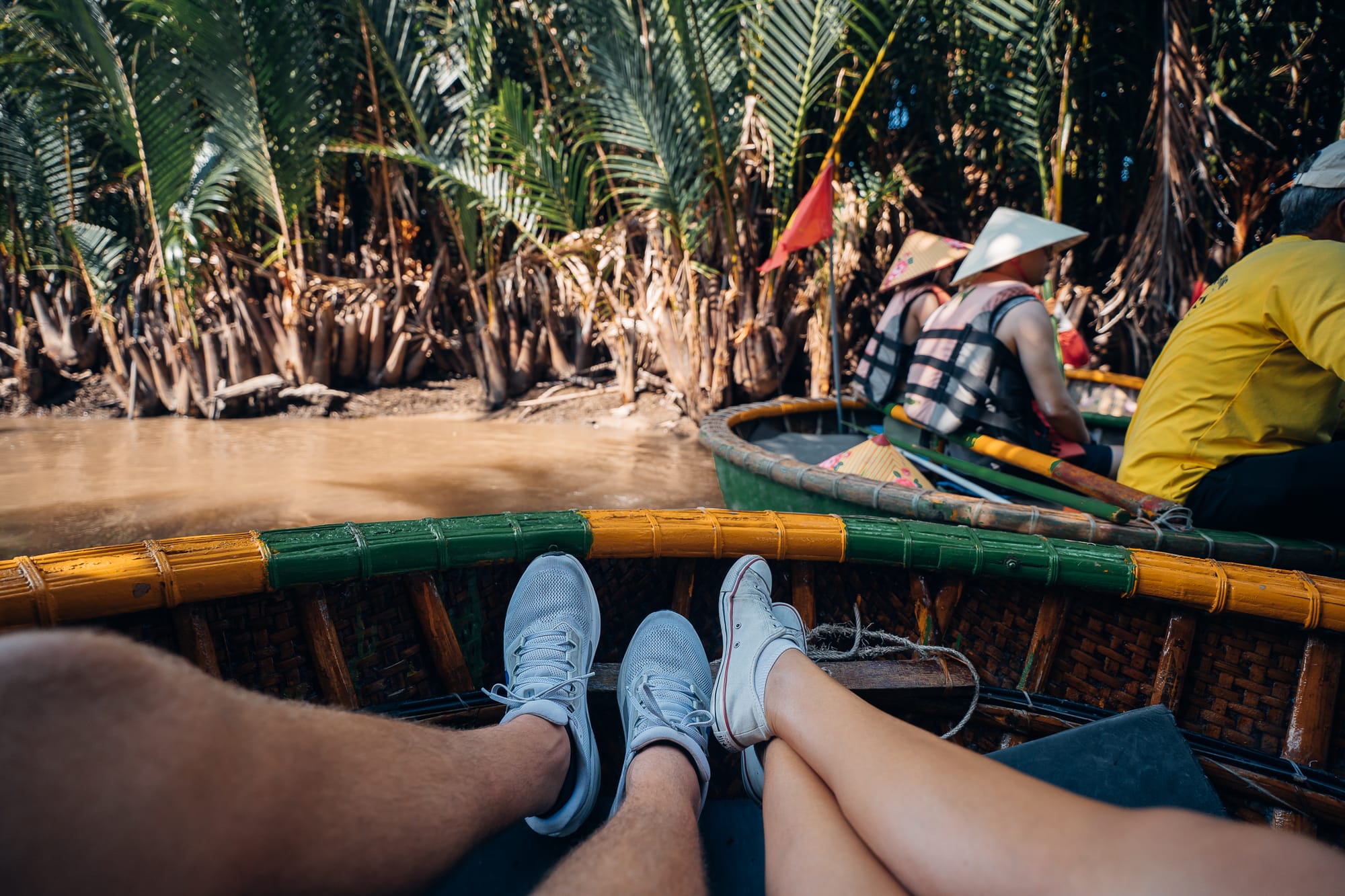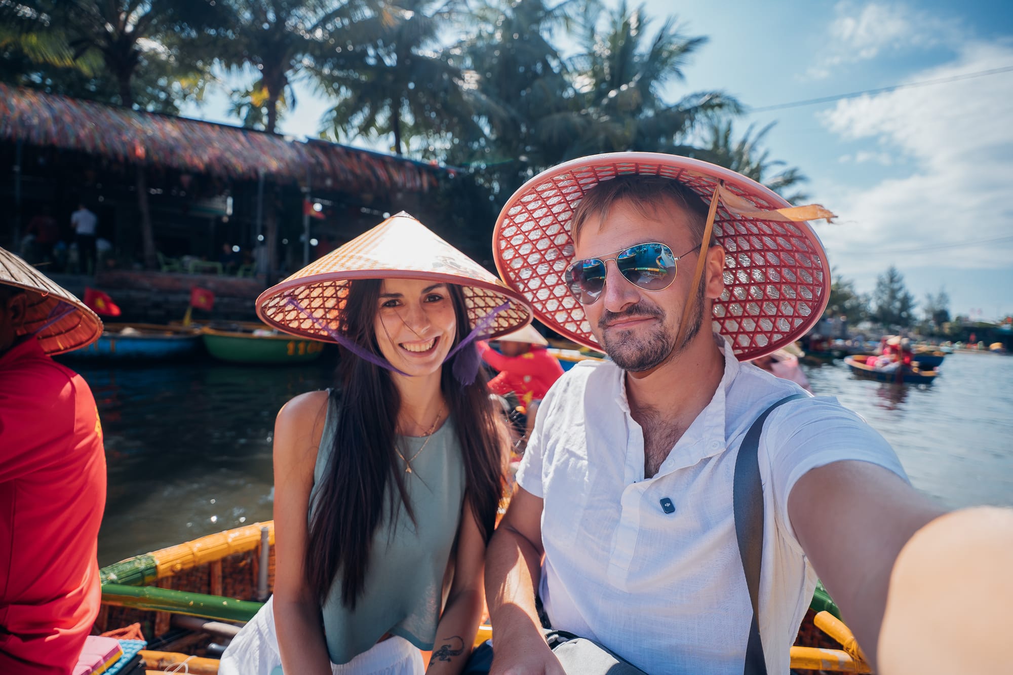 Auf dem Fluss tummelten sich bereits unzählige kleine, bunte runde Kokosnuss-Boote, hier traditionell als "Basket Boats" bezeichnet. Die runden Nussschalen sind typisch in Vietnam und sehen wirklich aus, wie gigantische Kokosschalen mit einer Bank in der Mitte. Über eine selbstgebaute Holztreppe wurden wir auch schon zu zweit in eines dieser Basket-Boats gesetzt. Auf unsere Nachfrage, was die Bootsfahrt kostet, zahlten wir 600.000 Dong, ca. 20€. Für vietnamesische Verhältnisse ist dieser Betrag im übrigen der höchste, den wir bisher irgendwo bezahlt haben. Wir wurden noch mit zwei traditionellen vietnamesischen Reishüten als Sonnenschutz ausgestattet und schon paddelte unser Fahrer mit uns los. Rund um uns herum waren unzählige andere der Kokosnussschalen-Boote, alle paddelten den Fluss hinunter. Alleine in diesem kleinen runden Boot zu sitzen, ist eine einmalige Erfahrung und definitiv sehr cool. Aber man hat auch direkt gemerkt, dass das hier ein mehr als touristischer Ort ist. Aber gut, so ist das eben manchmal einfach. Wir sind den breiten Fluss entlang gepaddelt bis zu einer Flusskreuzung, wo es auf der rechten Seite in einen schmaleren, von Bambus umrahmten Flussarm hinein ging. Bevor wir in den schmalen Fluss abgebogen sind, wurde vom Ufer aus noch ein Foto von uns in unserem Basket-Boat gemacht. Nach diesem Foto mussten wir dann Schwimmwesten anziehen. Der Fahrer erklärte uns, dass die Polizei sonst hohe Strafen fordert. Wenige Meter später konnten wir die Westen allerdings wieder ausziehen, also scheint die Kontrolle dort nur auf bestimmten Flussabschnitten zu sein.