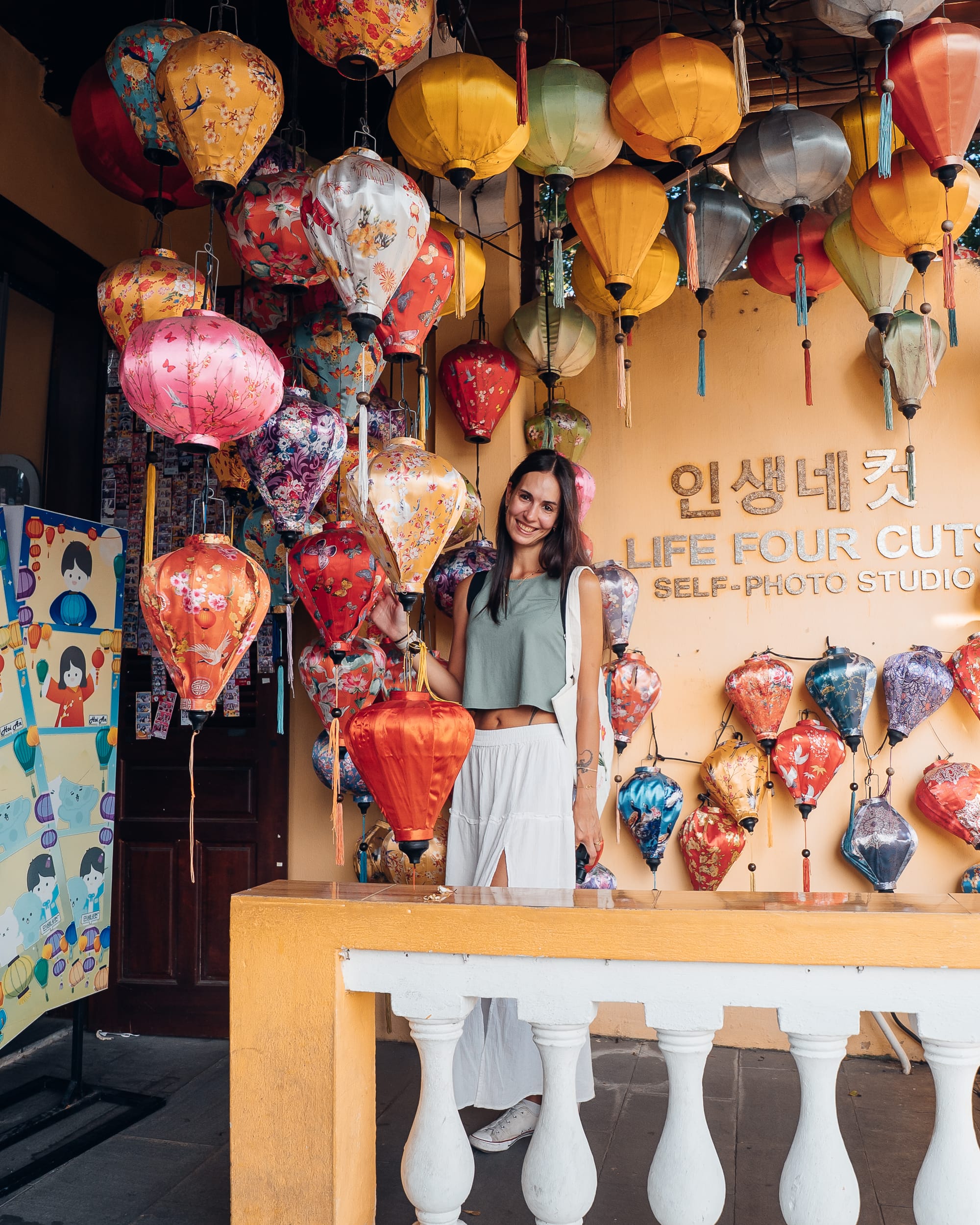 Fast genauso fasziniert wie von den vielen handgemalten Bildern waren wir von den vielen Schneidern, die Seidenkleider und auch Anzüge anbieten. Hier gibt es allerdings große Qualitätsunterschiede, die man aber bei einem kurzen berühren der Stoffe eigentlich leicht bemerkt. In einem kleinen Laden, etwas abseits der beliebtesten Gassen, hat Marc ein Kleid entdeckt, was uns beiden sofort gut gefallen hat. Ein traditioneller chinesischer Stil, dennoch aber modern und nicht zu auffällig in dezenten aber wunderschönen Farben. Die Schneiderin hat uns sofort nett beraten, uns alles erklärt und so habe ich das Kleid anprobiert. Leider war es etwas zu groß, was aber kein Problem war. Noch im Laden wurden meine Maße genommen und das Kleid wurde direkt für mich abgeändert. So sind wir eine Stunde später erneut hier her geschlendert und haben mein neues, maßangepasstes Seidenkleid abgeholt. Ebenfalls super günstig! Und so schön. Wahnsinn! Auf unserem Weg durch die Gassen haben wir dann noch einen handbemalten Fächer mit individuellen Design und unserer eigenen kaligrapisch gestalteten Gravur erworden. Hoi An ist ein wahres Shoppingparadies!