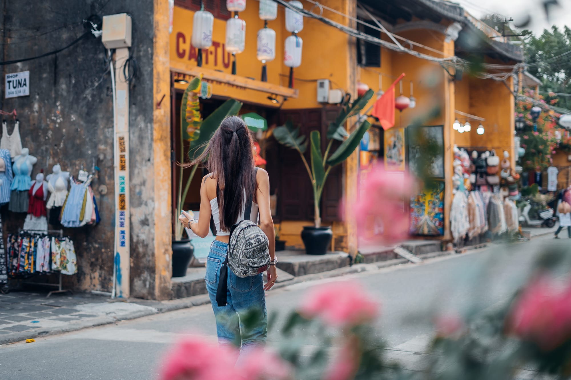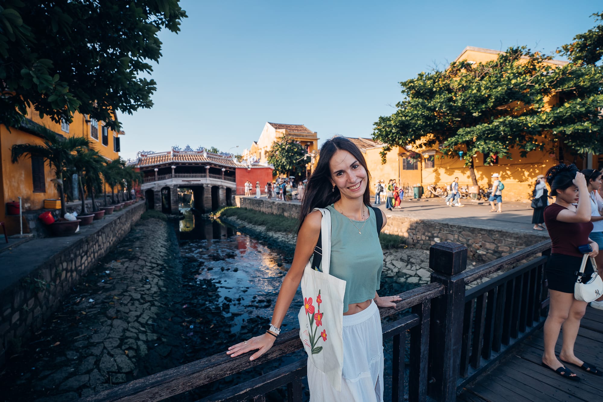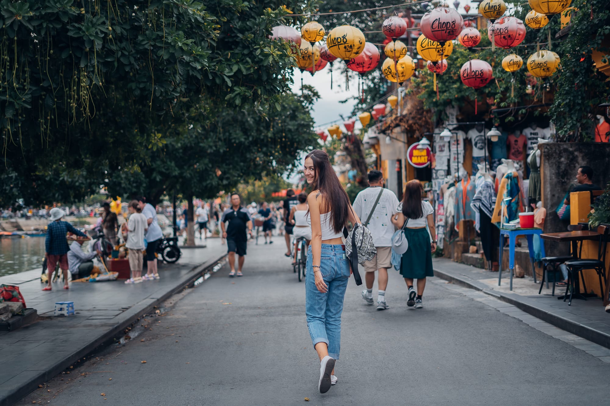 Am späten Nachmittag sind wir dann weiter durch Hoi An geschlendert, einfach drauf los und ohne besonderes Ziel. Gemeinsam mit vielen anderen Besuchern und Touristen sind wir so über die alte Holzbrücke mit Blick auf die alte japanische Brücke "Chùa Cầu" und den Fluss von Hoi An auf der anderen Seite schließlich in den wunderschönen Gassen der historischen Altstadt gelandet. Die Straßen sind nahezu alle eingerahmt von grünen Bäumen, Pflanzen, bunten Blumen und natürlich den typisch vietnamesischen Laternen. Man weiß gar nicht, wo man zuerst hinschauen soll, weil alles so toll und schön aussieht. Die Menge an Touristen macht es dann natürlich nicht besser. Es gibt zahlreiche kleine Läden mit Kunstwerken, Souvenirs, Handwerkskunst, vietnamesischen Speisen, Kaffee, Tee oder auch Schokolade. Zwischen den unzähligen Shoppingmöglichkeiten gibt es mindestens genau so viele Cafés, Restaurants und Bars. Ein Gebäude schöner und interessanter gestaltet, als das andere. Und als wäre das nicht genug, gibt es auch noch viele kleine Straßenstände, die typisch vietnamesische Köstlichkeiten wie Crispy Pancakes, Crepe, Obst, Tee und noch vieles mehr anbieten. Hoi An ist definitiv eine wunderschöne Stadt und ich kann verstehen, warum dieser Ort zum Weltkulturerbe erklärt wurde.