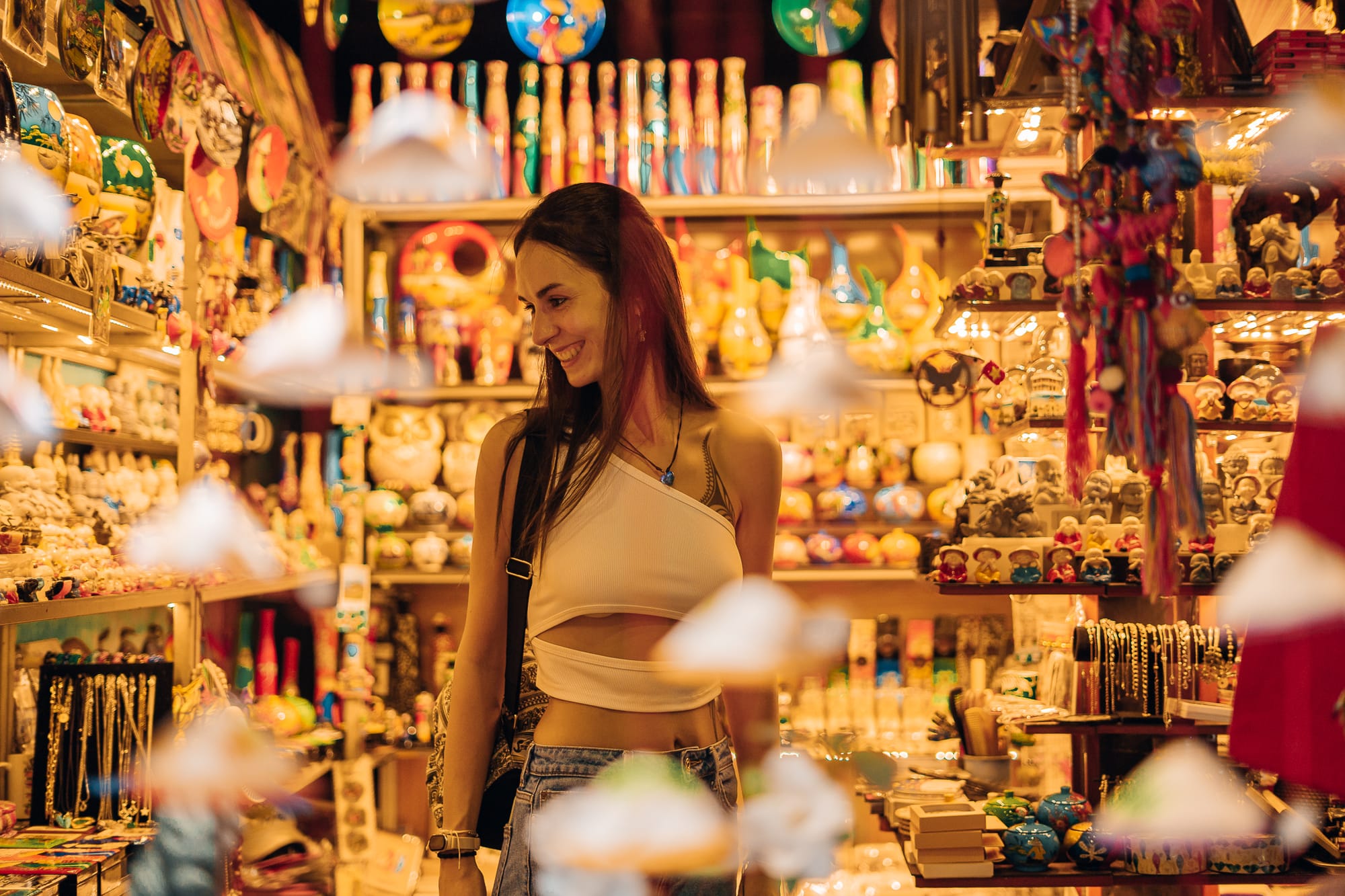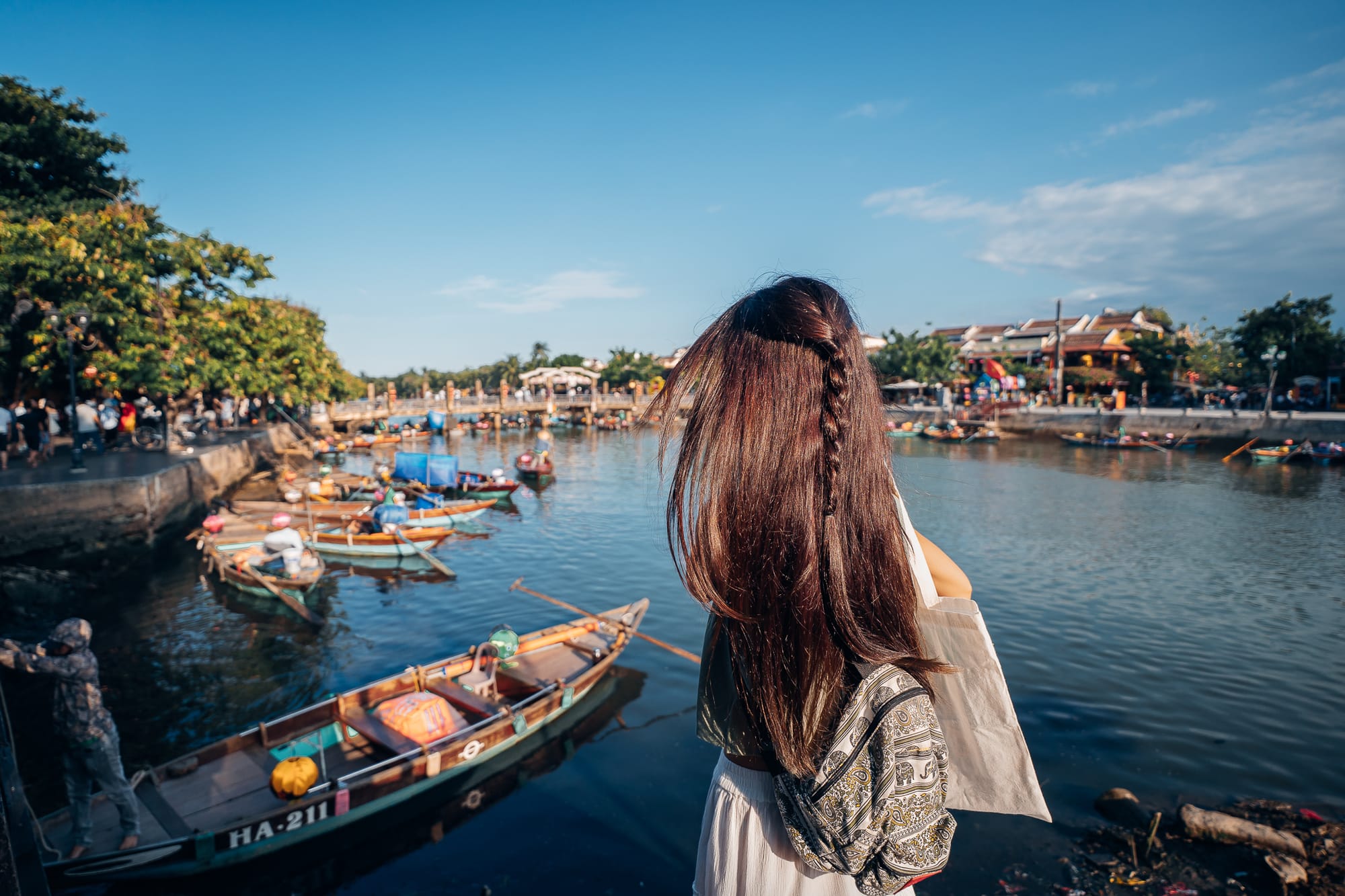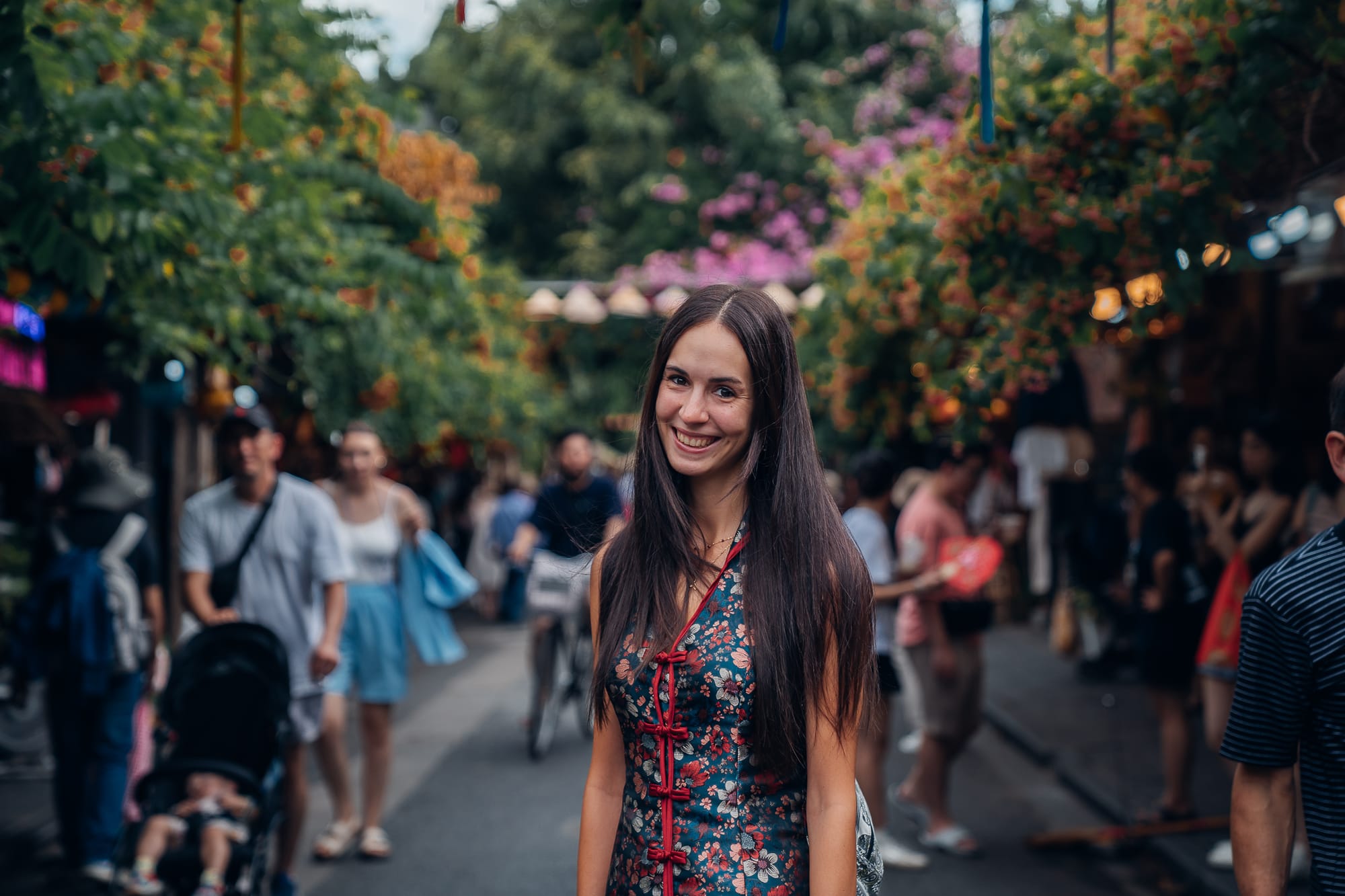 Am späten Nachmittag sind wir dann weiter durch Hoi An geschlendert, einfach drauf los und ohne besonderes Ziel. Gemeinsam mit vielen anderen Besuchern und Touristen sind wir so über die alte Holzbrücke mit Blick auf die alte japanische Brücke "Chùa Cầu" und den Fluss von Hoi An auf der anderen Seite schließlich in den wunderschönen Gassen der historischen Altstadt gelandet. Die Straßen sind nahezu alle eingerahmt von grünen Bäumen, Pflanzen, bunten Blumen und natürlich den typisch vietnamesischen Laternen. Man weiß gar nicht, wo man zuerst hinschauen soll, weil alles so toll und schön aussieht. Die Menge an Touristen macht es dann natürlich nicht besser. Es gibt zahlreiche kleine Läden mit Kunstwerken, Souvenirs, Handwerkskunst, vietnamesischen Speisen, Kaffee, Tee oder auch Schokolade. Zwischen den unzähligen Shoppingmöglichkeiten gibt es mindestens genau so viele Cafés, Restaurants und Bars. Ein Gebäude schöner und interessanter gestaltet, als das andere. Und als wäre das nicht genug, gibt es auch noch viele kleine Straßenstände, die typisch vietnamesische Köstlichkeiten wie Crispy Pancakes, Crepe, Obst, Tee und noch vieles mehr anbieten. Hoi An ist definitiv eine wunderschöne Stadt und ich kann verstehen, warum dieser Ort zum Weltkulturerbe erklärt wurde.