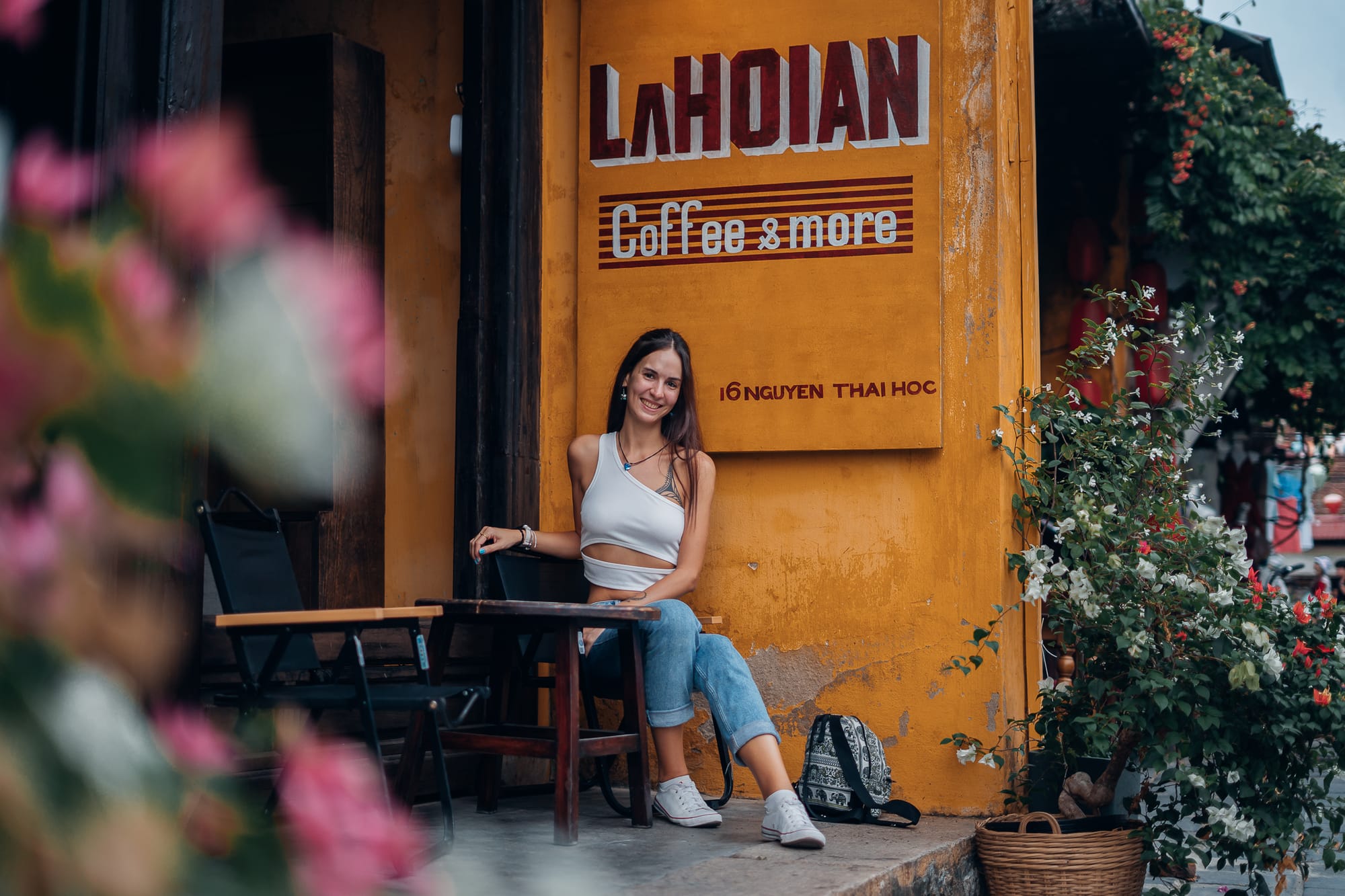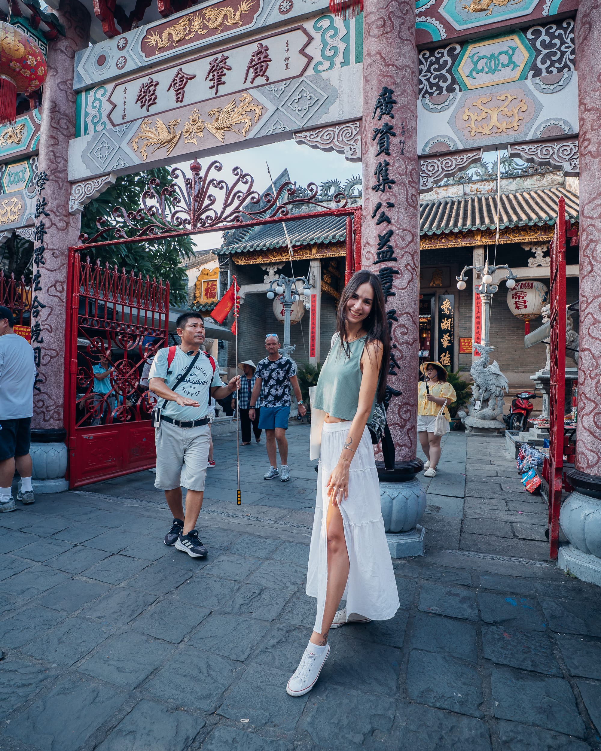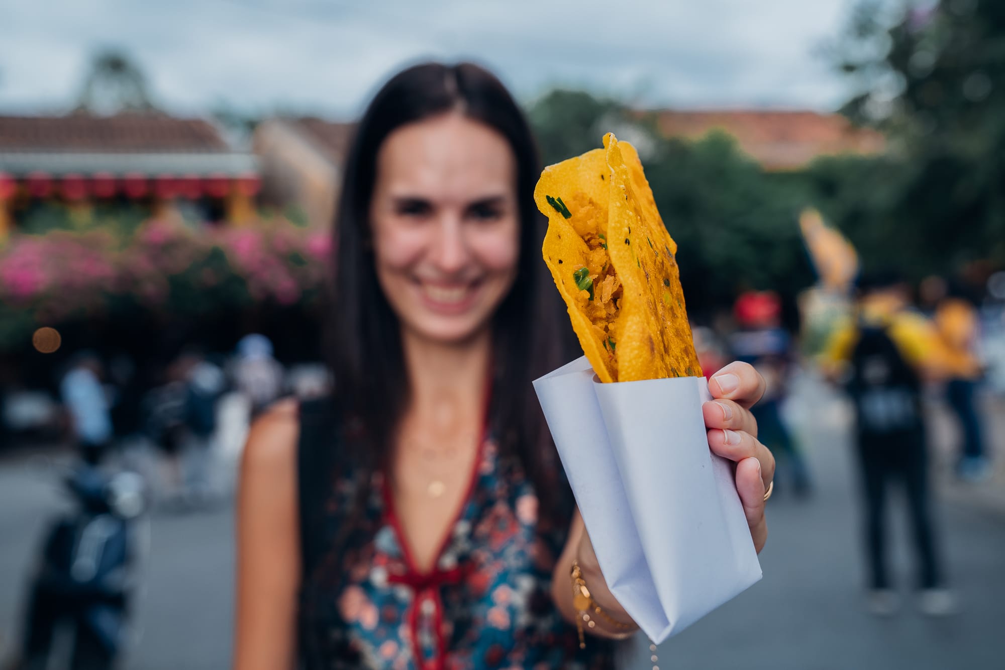 Da es uns aber etwas zu voll war, sind wir einfach ein wenig abseits der Touristenmassen durch abliegendere Gassen und Straßen geschlendert. Klar, in Hoi An gibt es natürlich bekannte und beliebte Spots, wie beispielsweise das Café "Moments Hoi An" oder auch diverse Tempel und andere Instagramspots, die dann natürlich sehr überfüllt und überlaufen sind. Keine Frage, diese Spots sind nicht ohne Grund so beliebt, allerdings gibt es in Hoi An auch abseits der Touristenspots wunderschöne Gassen und mehr als genug zu entdecken. So haben wir uns auf dem Weg durch die historische Altstadt an einem Straßenstand einen veganen "Pancake" aus Süßkartoffeln, Kokos und Bohnen geholt und noch einen traditionellen, vietnamesischen Crispy Pancake "Banh Xeo" für Marc. Gestärkt von den leckeren Snacks sind wir ziellos umhergelaufen und haben einfach die ganzen Eindrücke auf uns wirken lassen. Wir waren in vielen der kleinen Shops, haben uns zwischendurch etwas kühles zu trinken geholt und auch mal auf einer Bank am Straßenrand niedergelassen und von dort das bunte Treiben Hoi Ans bewundert. Wir waren mehr als geflasht von Hoi An und mindestens genau so begeistert. Ich hatte absolut nicht erwartet, dass diese vietnamesische Stadt mir/uns so unfassbar gut gefallen würde.