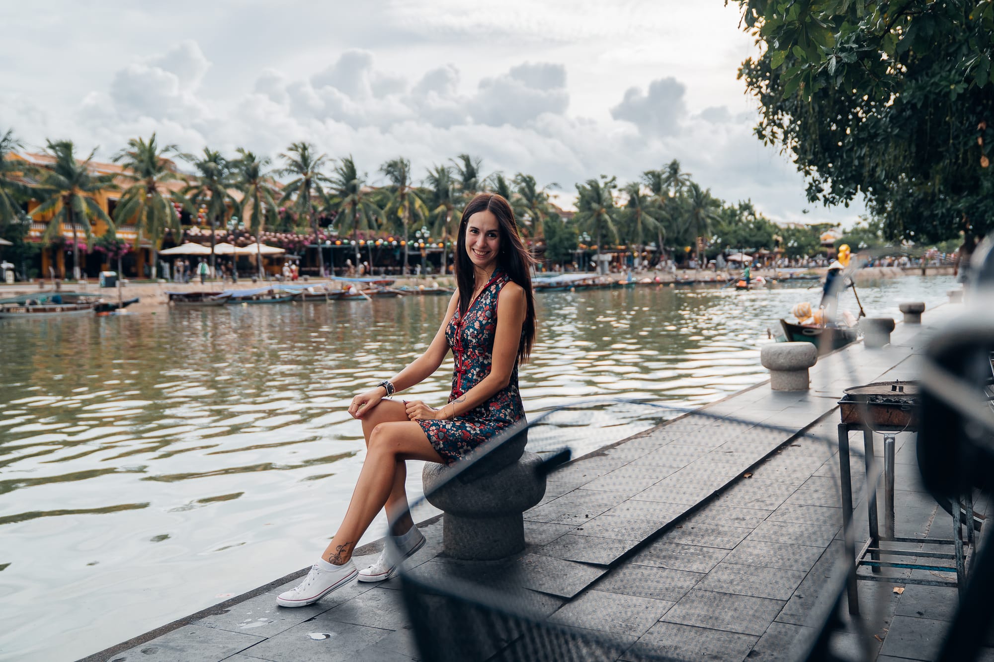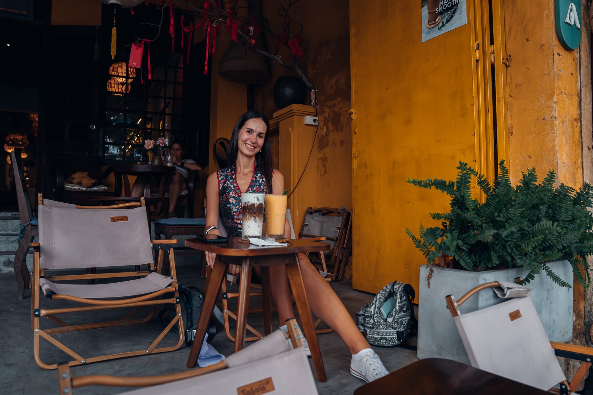 In einer knapp 15 minütigen Fahrt ging es dann auch weiter nach Hoi An. Dort angekommen, wussten wir zunächst auch nicht, ob wir vielleicht sogar hier ein Ticket brauchen, um die "Ancient City" anzusehen. Zumindest stand an der Brücke die auf die andere Flussseite zur Ancient City führt ein Häuschen, wo Tickets verkauft wurden. Da wir aufgrund der Erfahrung in Coconut Village nicht schon wieder Tickets kaufen wollten, sind wir einfach zunächst auf der Flussseite entlang spaziert, wo wir waren. Hier wurden wir direkt von kleinen Cafés, netten Shops und Restaurants empfangen. In einem der Cafés (Café INN) haben wir uns in den kleinen Stühlen niedergelassen und uns erstmal einen kühlen Smoothie (Drachenfrucht-Banane) und einen Peanut-Coffee gegönnt. Nach der Bootsfahrt und dem schnellen "Spinning-Ride" hat es dann gut getan, hier einfach erst mal in aller Ruhe etwas zu trinken und in Hoi An anzukommen. Außerdem hatten wir von unseren Plätzen aus einen tollen Blick auf den Fluss und die gegenüberliegende Altstadt von Hoi An. Die Café-Kultur in Vietnam ist etwas, was wir beide sehr lieben und bisher noch in keinem anderen Land so erlebt haben. Egal wo man ist, überall gibt es kleine Cafés, eigentlich alle haben auch guten und leckeren Kaffee und laden gerade zu zum Entspannen ein. So haben wir hier etwa eine dreiviertel Stunde einfach das Treiben beobachtet und uns bequem zurückgelehnt.